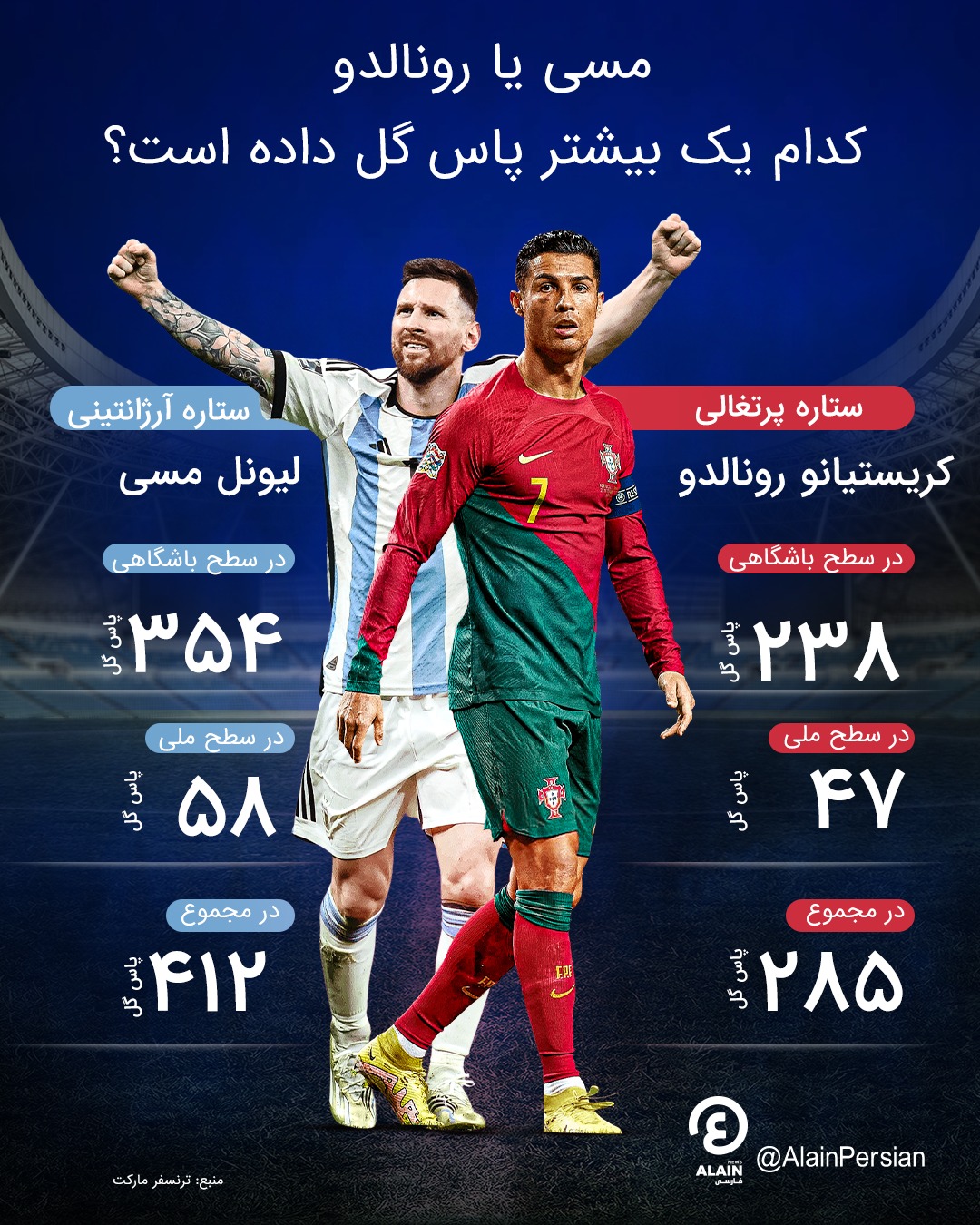 عکس : مقایسه تعداد پاس گل لیونل مسی و کریستیانو رونالدو