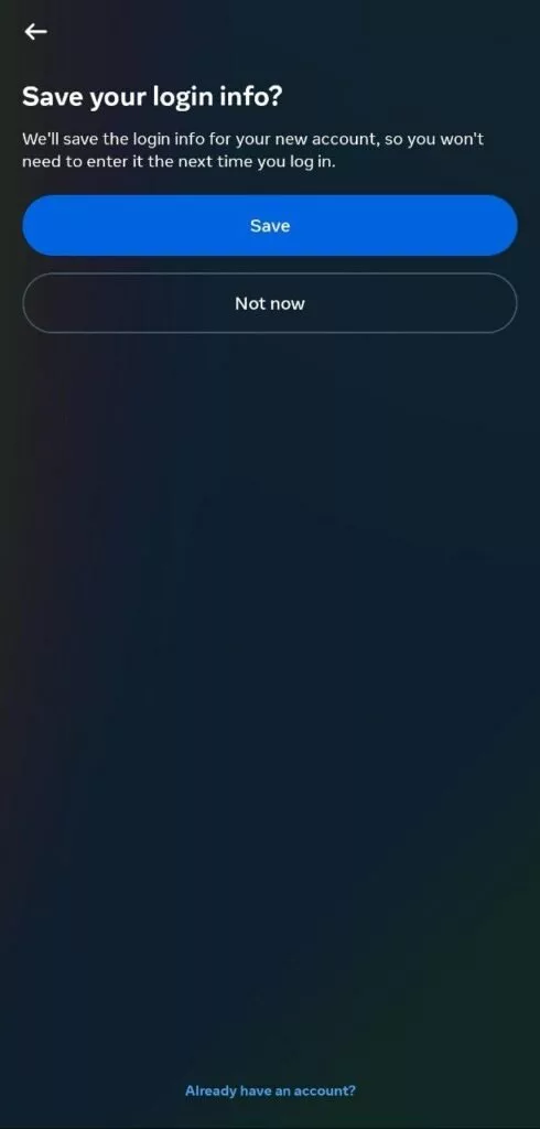 - سپس اینستاگرام از شما سؤال میکند که آیا مایل هستید اطلاعات ورود به حساب خود را ذخیره کنید یا خیر. با ذخیرهکردن آن، در دفعات بعدی دیگر نیاز نیست تا رمزعبور خود را وارد کنید. این قابلیت را براساس نیاز خود میتوانید فعال کنید.