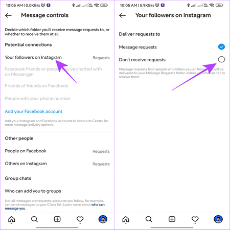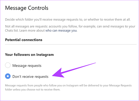 مرحله 5: «Your followers on Instagram» را انتخاب کنید و «Don’t receive requests» را انتخاب کنید.