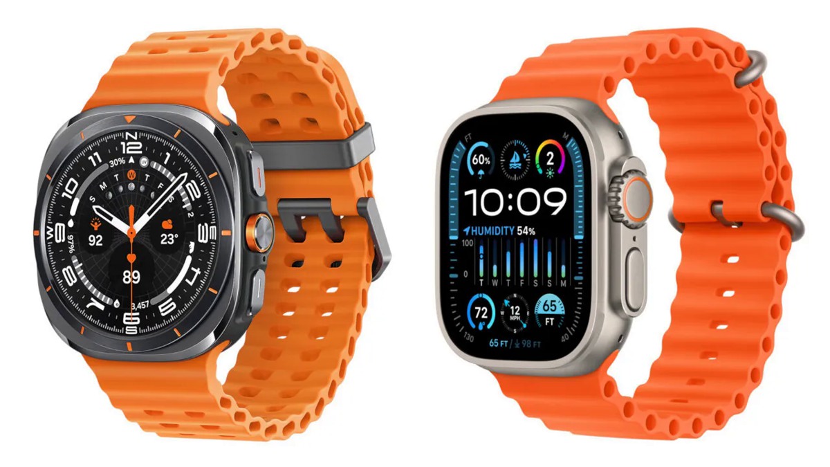 عکس : شباهت گلکسی واچ اولترا به اپل واچ اولترا اپلگلکسی بادز 3 و گلکسی بادز 3 پرو اکنون دارای ساقههایی هستند، شبیه به ایرپادز اپل و چندین هدفون بیسیم دیگر در بازار. طراحی جعبهای، درشت و تم نارنجی گلکسی واچ اولترا نیز شبیه به اپل واچ اولترا است. طرفداران دیرینه سامسونگ از این شرکت بهدلیل کنار گذاشتن زبان طراحی خود بهنفع الهام از طراحی اپل ناامید شدهاند.