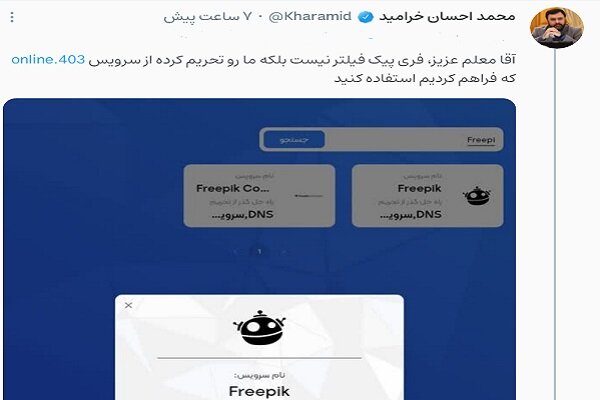 به گزارش خبرنگار مهر، محمد احسان خرامید رئیس روابط عمومی وزارت ارتباطات و فناوری اطلاعات در شبکه اجتماعی ویراستی در پاسخ به یک گرافیست که از عدم دسترسی به «فری پیک» گلایه کرده بود، گفت: فری پیک فیلتر نیست بلکه ما را تحریم کرده است می توانید از سرویس Online.403 که فراهم کردیم استفاده کنید.
