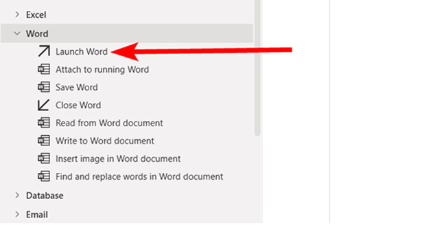 حالا زمان آن است که جریان را با برخی اقدامات پر کنید. برای افزودن اقدام باز کردن فایل ورد، بخش "ورد" را در نوار کناری چپ گسترش دهید و روی اقدام "باز کردن ورد" دوبار کلیک کنید. سپس مسیر فایل سند را وارد کرده و آن را ذخیره کنید.
